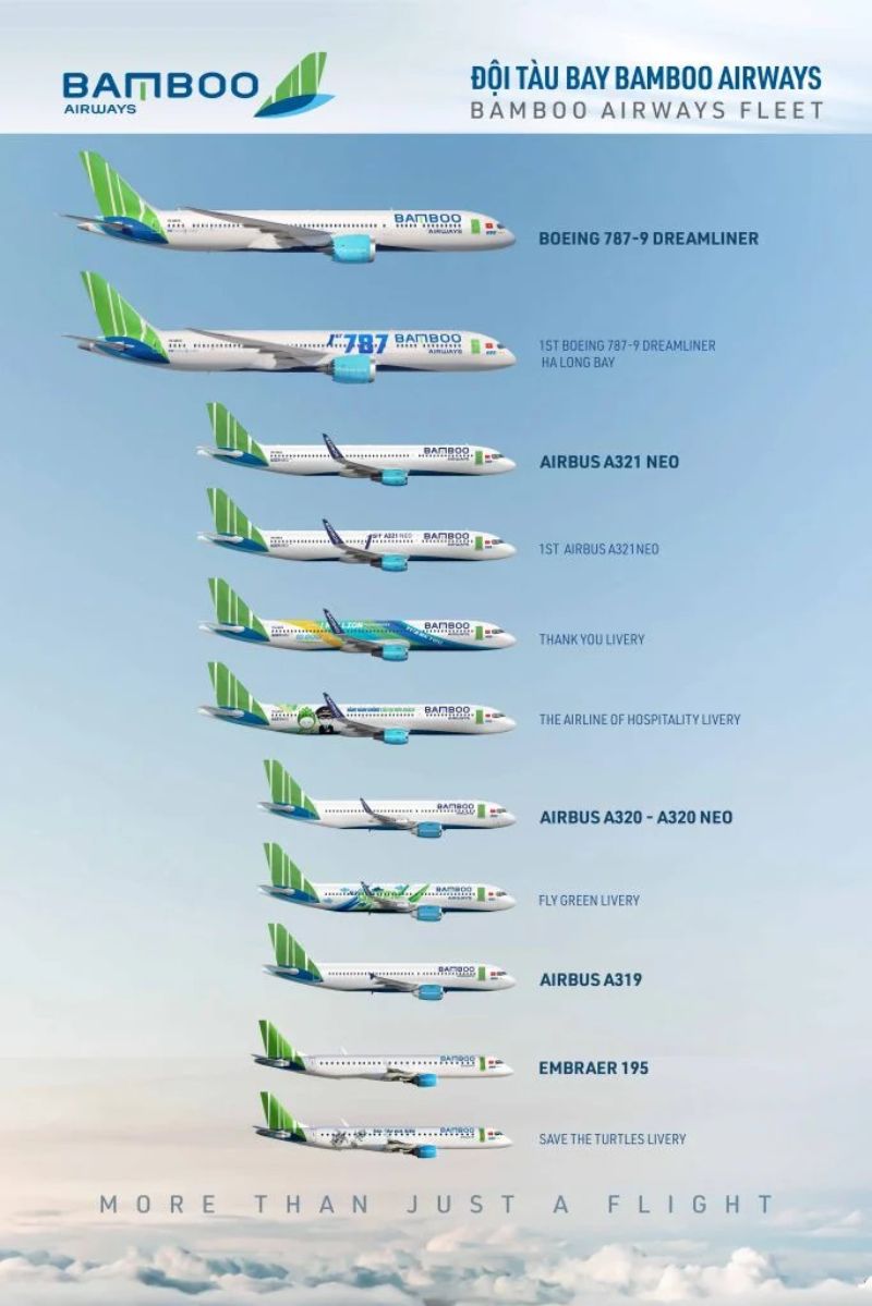 Bamboo Airways hiện vận hành đội tàu đa chủng loại, bao gồm các dòng máy bay thân rộng, máy bay thân hẹp và phản lực khu vực. Với nhiều tầm bay và tải trọng, đội tàu bay này cho phép Bamboo Airways khai thác linh hoạt và hiệu quả từ các đường bay nội địa chặng ngắn, cho đến các đường bay quốc tế trung và dài kết nối các nước châu Á, châu Âu, châu Úc, châu Mỹ…
