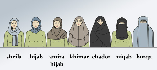 Vì phải che kín hoàn toàn, nên phụ nữ hồi giáo phải dùng khăn che: Các loại khăn này giống như một kiểu áo dài của phụ nữ, che phủ toàn bộ cơ thể và cả gương mặt, chỉ chừa lại phần vải thưa ở mắt để người phụ nữ có thể nhìn ra ngoài. Trước kia có 7 loại khăn che mặt, sau này đa phần các nhóm phụ nữ hồi giáo chỉ sử dụng 5 loại khăn che mặt sau: